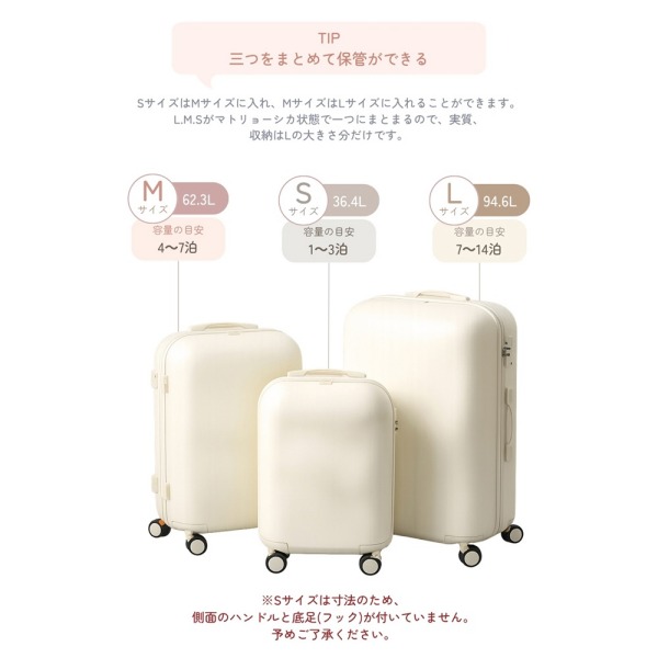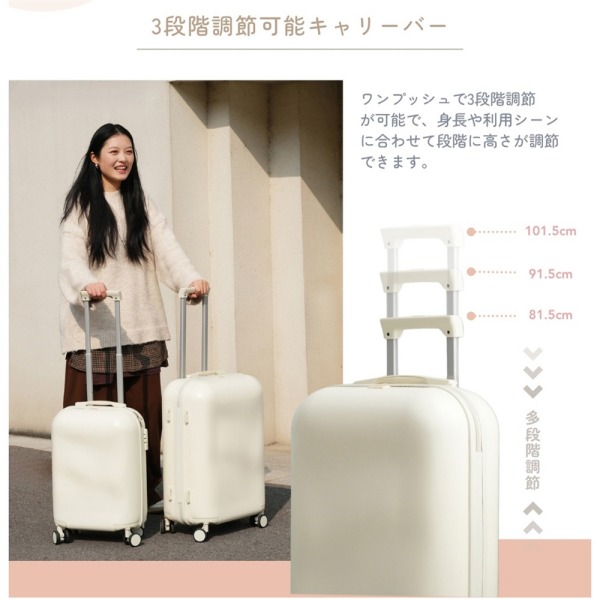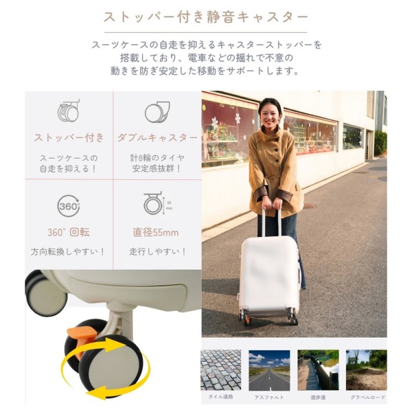 スーツケースの自走を抑えるキャスターストッパーを搭載しており、電車などの?れで不意の動きを防ぎ安定した移動をサポートします。