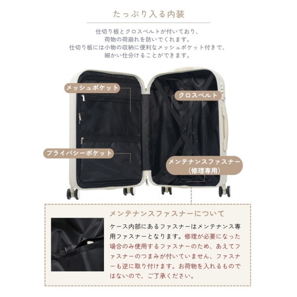 仕切り板とクロスベルトが付いており、荷物の荷崩れを防いでくれます。仕切り板には小物の収納に便利なメッシュポケット付きで、細かい仕分けることができます。