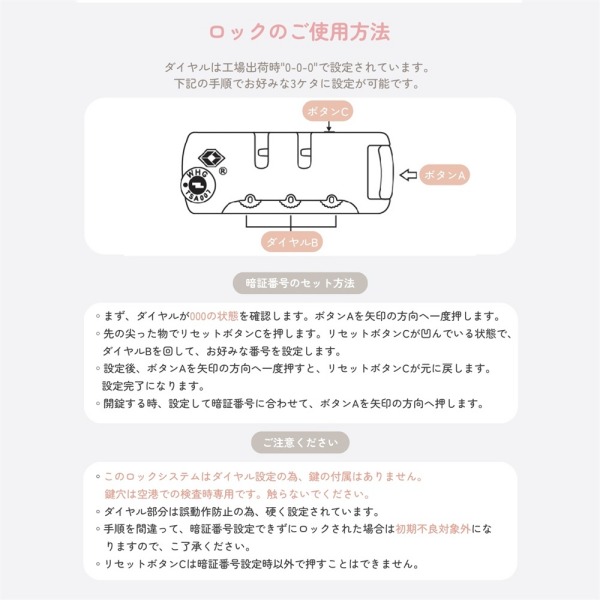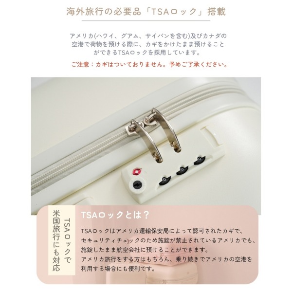 アメリカ(ハワイ、グアム、サイパンを含む)及びカナダの空港で荷物を預ける際に、カギをかけたまま預けることができるTSAロックを採用しています。