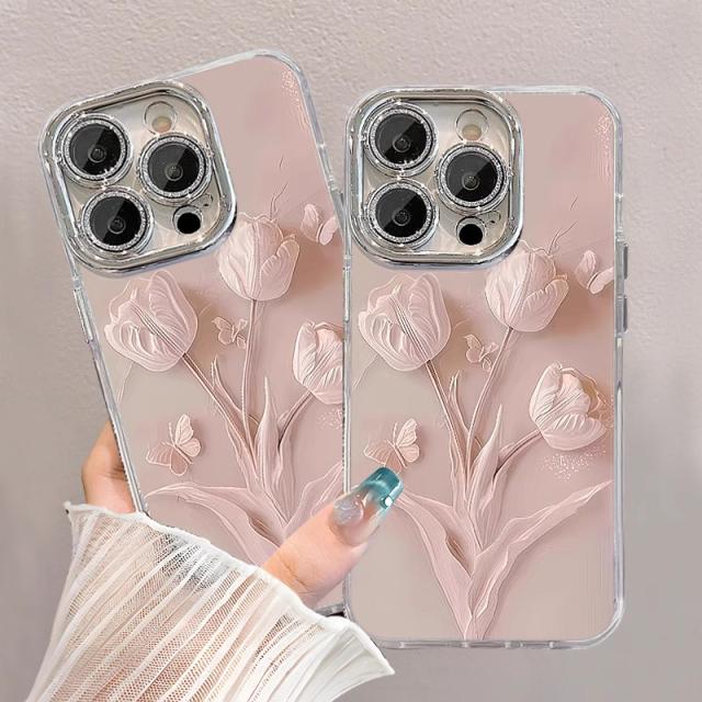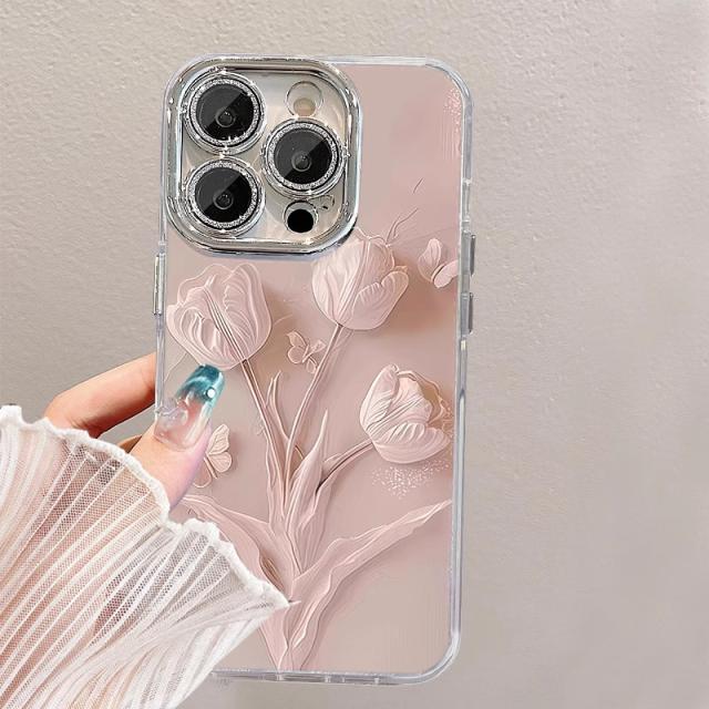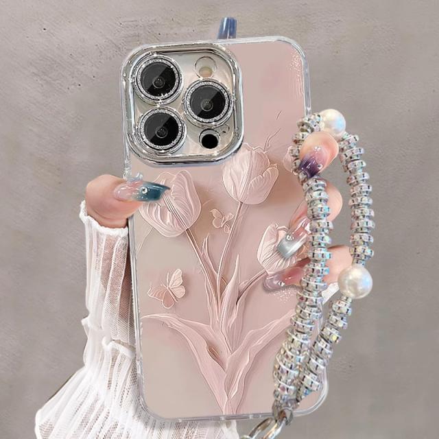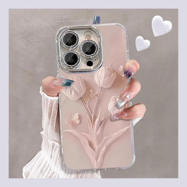 クリームピンクのチューリップ柄iPhone 16Pro Max専用ケースiPhone 15用レンズ保護フィルム付き13カップル向け新作12フェザーシャワーProメイドインガール17サンデッキストラップ付Plus 14全面保護耐衝撃Xハードケース