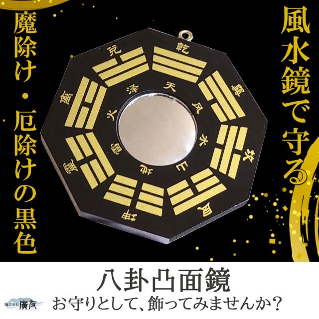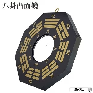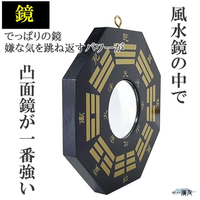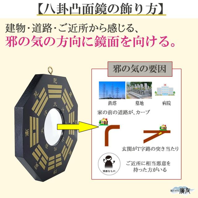 墓地、葬儀場、病院の近くや、古戦場・埋め立て地など陰の気が溜まりやすい地域には、この「八卦凸面鏡(黒)」が最適です。