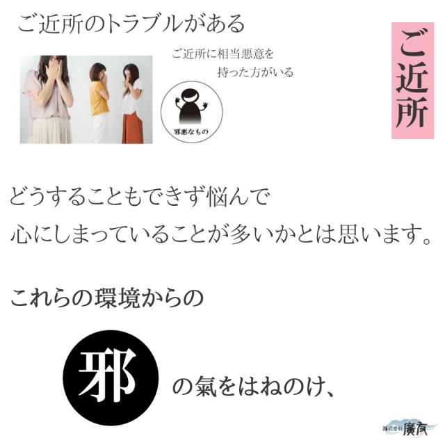 | 凸面鏡 | 邪気をはね返し拡散。障害物、威圧的な建造物、ご近所トラブル対策に。 |