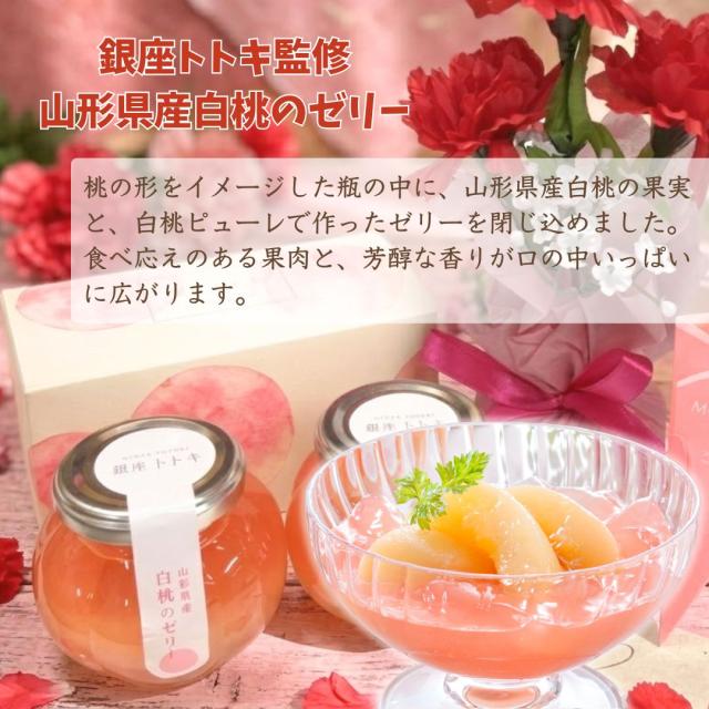 <商品説明>桃の形をイメージした瓶の中に、山形県産白桃の果実と、白桃ピューレで作ったゼリーを閉じ込めました。食べ応えのある果肉と、芳醇な香りが口の中いっぱいに広がります。銀座フレンチの名店が監修するスイーツギフト。