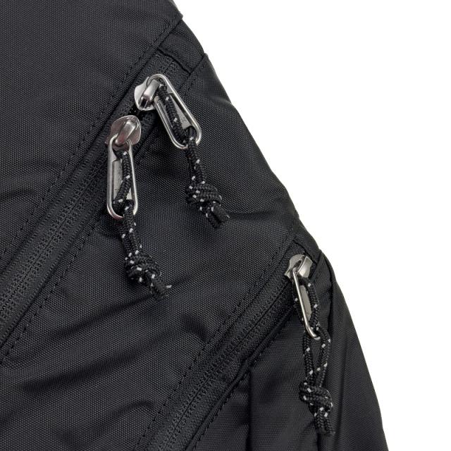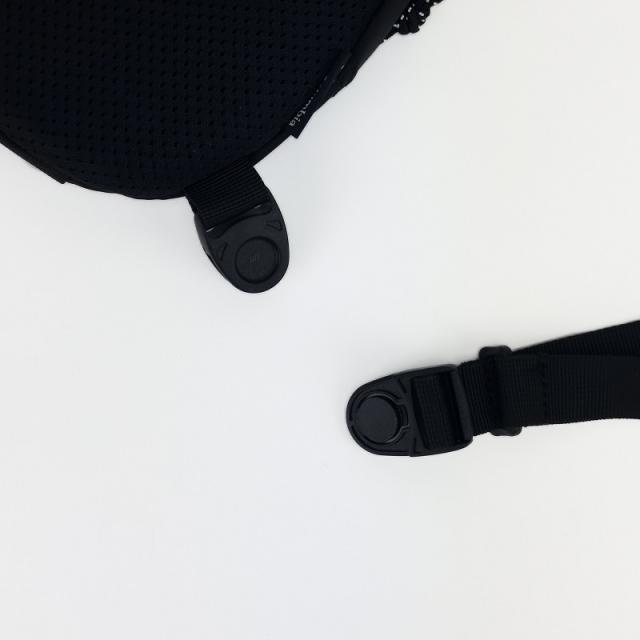 ショルダーハーネスには、小物類などがぴったり収まるストレッチメッシュ素材のファスナーポケットを配置。