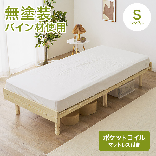 ベッド シングル ベッドフレーム マットレスセット ポケットコイル すのこ 天然木 木製 パイン材 高さ調節 ロースタイル ヘッドレス 北欧 通気性 ヘッドレス 継ぎ脚 ステージベッド ロースタイル