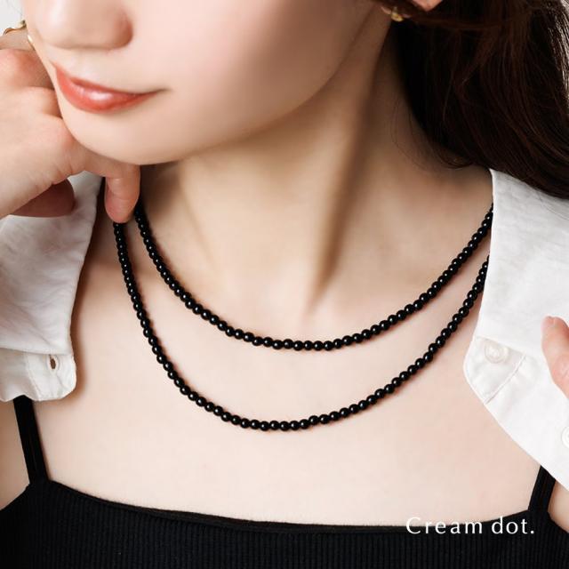 ブラックボールのロングネックレス。超ロング丈がつくる縦長フォルムと艶っぽいブラックカラーがスタイリッシュなアクセントに。1連でも2連にしても、コーデに合わせて自在にアレンジ可能◎