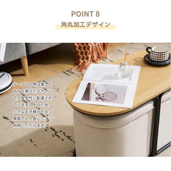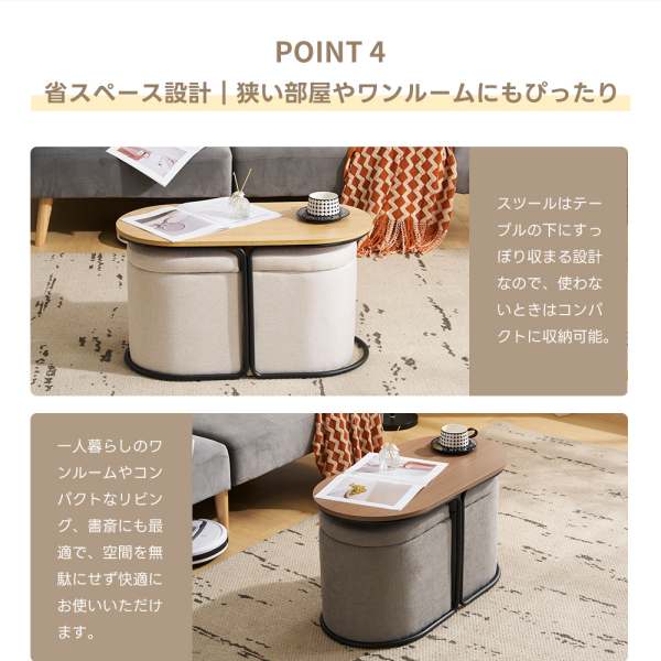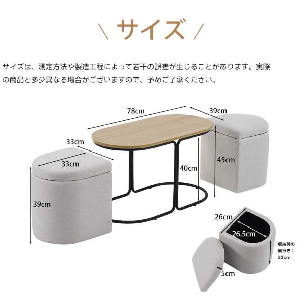 届いたらすぐに使えるのも嬉しいポイント!スツールの蓋を開けるだけで収納可能で、組み立ての手間が一切かかりません。毎日の暮らしを快適にする、実用性の高いテーブルセットです。