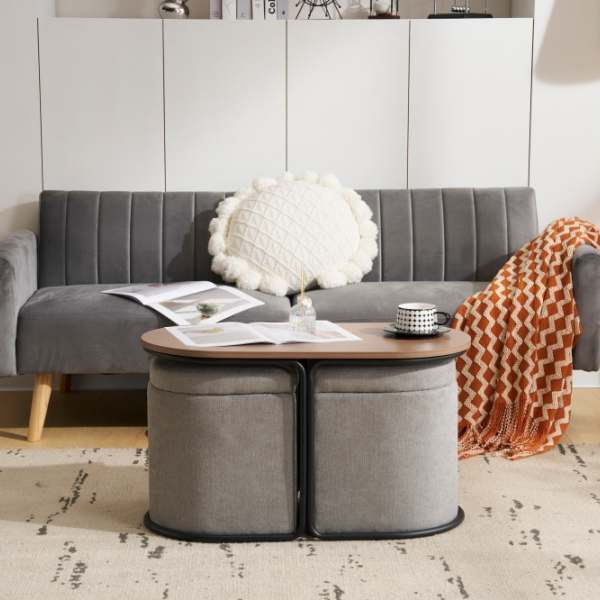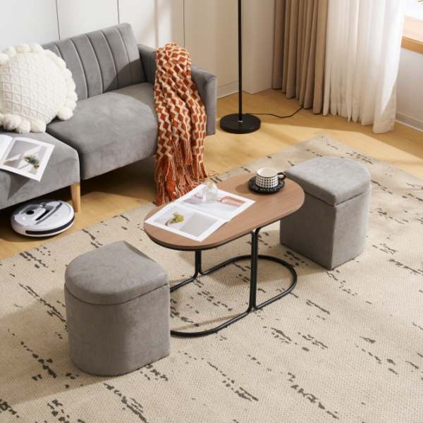 このテーブルセットは、センターテーブルとしてだけでなく、サイドテーブルやスツールとしても活用できる多機能デザイン。