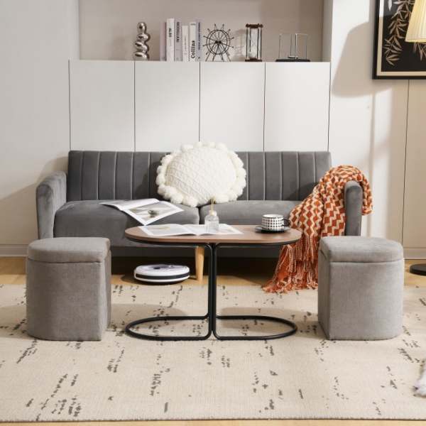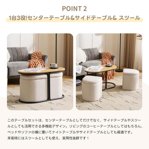 このテーブルセットは、センターテーブルとしてだけでなく、サイドテーブルやスツールとしても活用できる多機能デザイン。リビングのコーヒーテーブルとしてはもちろん、ベッドやソファの横に置いてナイトテーブルやサイドテーブルとしても最適です。来客時にはスツールとしても使え、実用性抜群です!