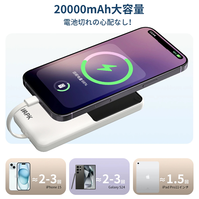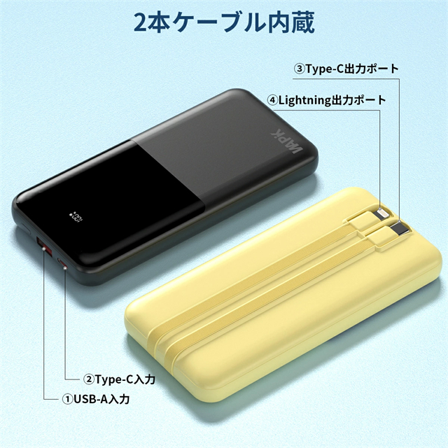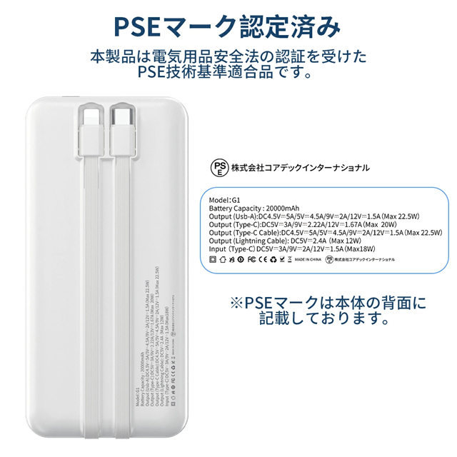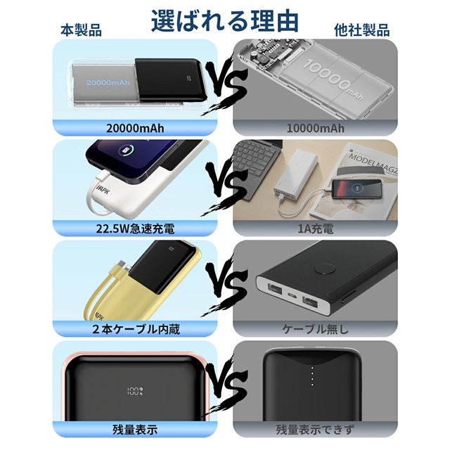 モバイルバッテリー 大容量 20000mAh 4台同時 2本ケーブル内蔵 22.5W急速充電 携帯バッテリー LED残量表示 タイプC PSE認証 軽量 小型 スマホ充電器 残量表示 iPhone/Android対応 機内持ち運び可 防災 旅行 出張 停電