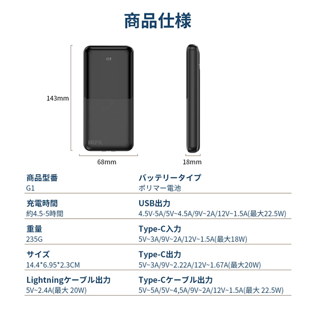 出力:5V-3.0A/9V-2A/12V-1.5A/10V-2.25A(22.5W Max)