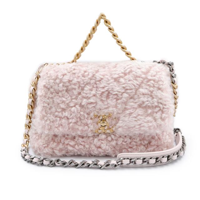 【コメント】 シャネル 2019 年秋冬コレクションで初めて発表されたシャネル 19 バッグは、シャネル 2.55 と同様に、発売年にちなんで名付けられました。この枕のように柔らかいショルダーバッグは、ピンクの特大キルティングツイードで作られています。