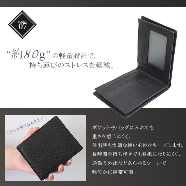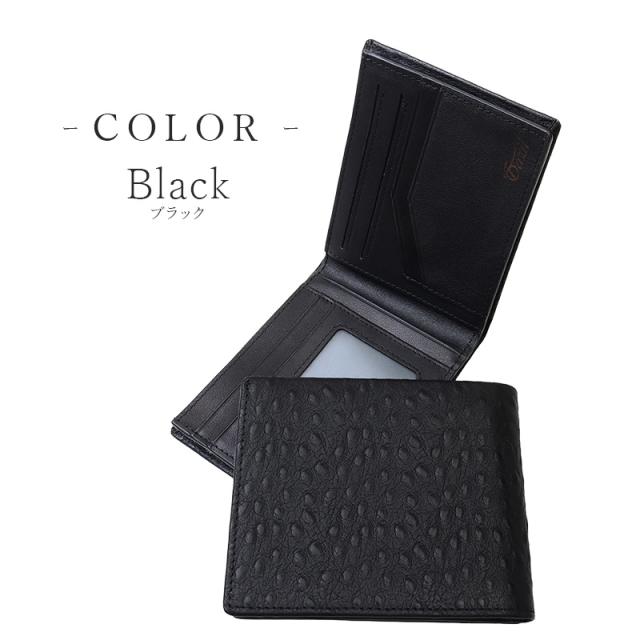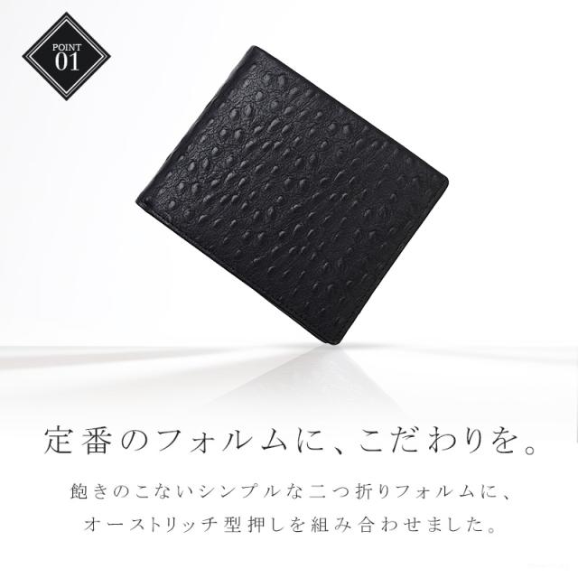 飽きのこないシンプルな二つ折りフォルムに、エキゾチックな表情のオーストリッチ型押しを組み合わせた逸品。