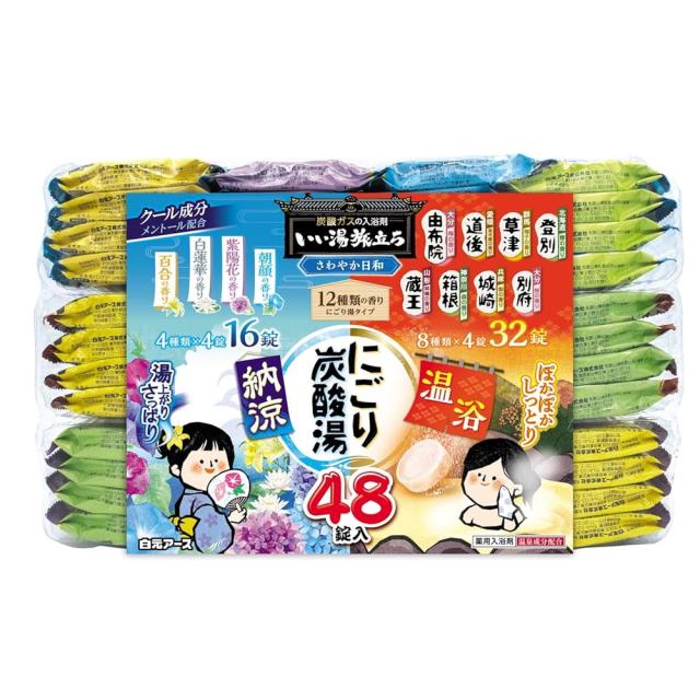 | 主な仕様 | ご自宅のお風呂で毎日にごり湯の温泉気分を楽しめる48錠入アソートパック 炭酸ガスが入浴効果を高め血行を促進し一日の疲れを和らげます。 納涼タイプ4種類、温浴タイプ8種類の風情漂う香りが日替わりで楽しめます。 原産国:日本 |