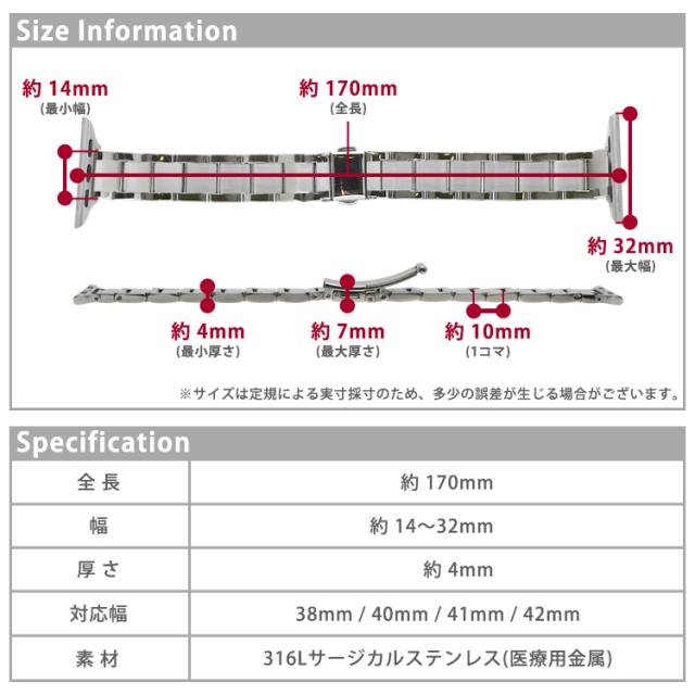 | 全長:約170mm 幅:約14〜32mm 厚さ:約4mm 対応サイズ:38mm / 40mm / 41mm / 42mm |