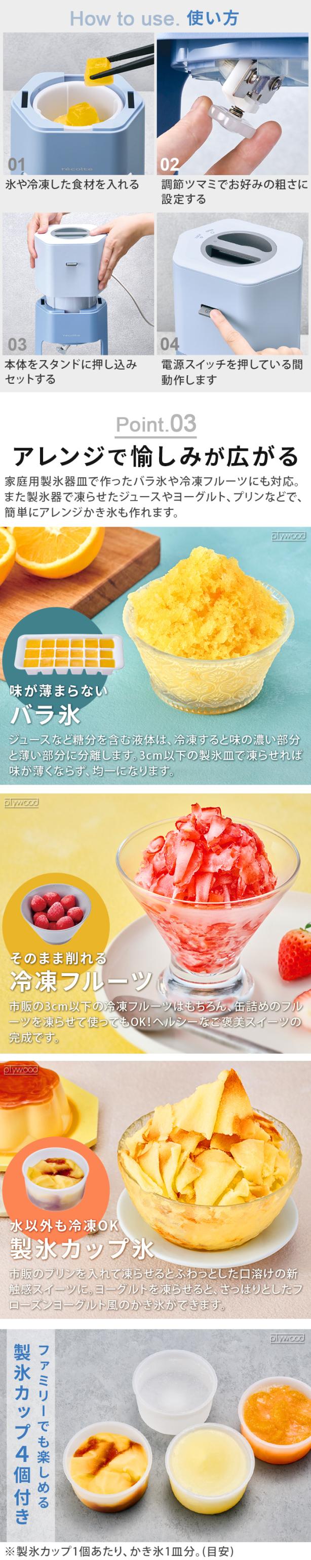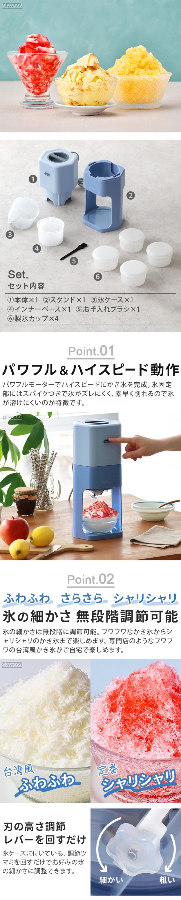 スイッチ一つの簡単操作で、驚くほどスピーディーに氷が削れる電動かき氷器の登場。 調節ツマミ付きで無段階の粗さ調節が可能。フワフワなかき氷からシャリシャリのかき氷まで好みに合わせて楽しめます。専用の製氷カップで作った氷や、家庭用の製氷皿で作ったバラ氷、冷凍フルーツなどにも対応。本体以外のパーツは取り外して丸洗い可能。本体は1.2kgと軽いので、棚などに収納しても簡単に出し入れできます。