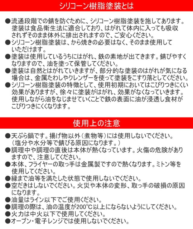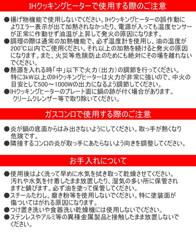 ・天ぷら鍋です。揚げ物以外(煮物等)には使用しないでください。 ・油温を200℃以上に上昇させないでください。 ・IHクッキングヒーターの揚げ物機能では使用できません。調理の際は通常の加熱機能で、必ず温度計を使用し、油の温度が200℃以内でご使用ください。 ・熱源を入れる時「中」以下で火力(出力)の調節を行ってください。 ・空焚きはしないでください。 ・調理中や調理直後は本体が熱くなっていますのでご注意ください。 ・本体の取っ手、フライヤーの取っ手は金属製ですので熱くなり火傷の危険があります。ミトン等を使用してください。 ・使用後はよく洗って早めに水気を拭き取って乾燥させてください。汚れや水気を付着したまま放置したり、湿気の多い所に保管されますと錆びます。必ず油を塗って保管してください。 ・つけ置き洗いや食器洗い乾燥機には使用しないでください。 |