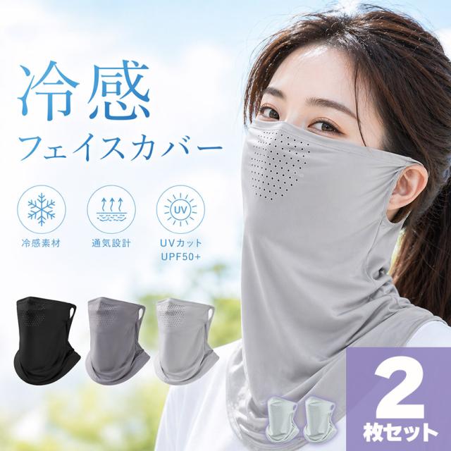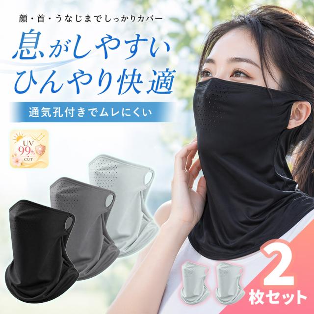2個セット 冷感フェイスカバー UVカット99% ネックガード 通気孔付き 耳掛け 日焼け防止 紫外線対策 ひんやり 伸縮 男女兼用 自転車 運転 アウトドア フェイスマスク 接触冷感 さらさら 通気性 自転車 ウォーキング ランニング 農作業