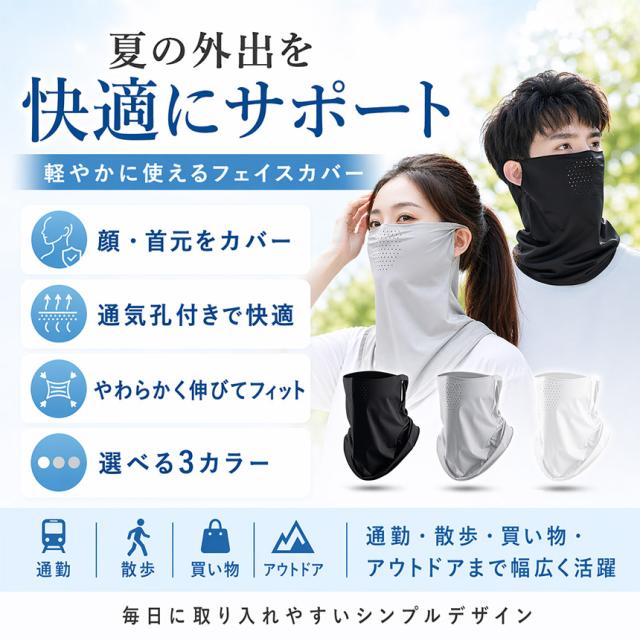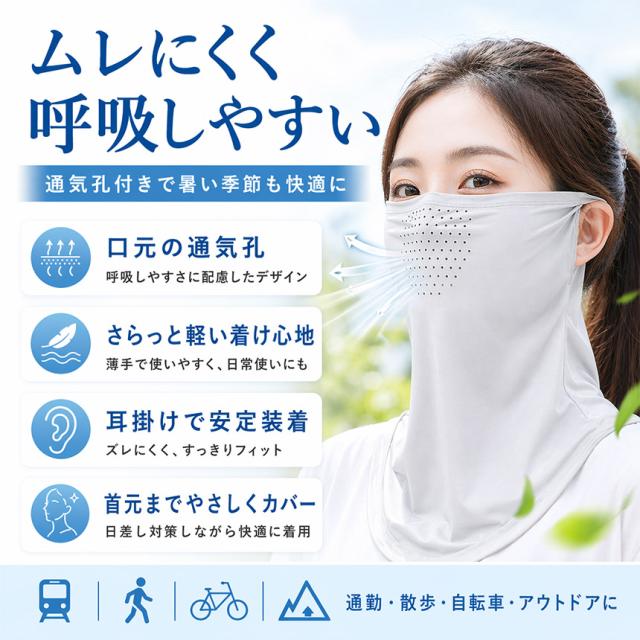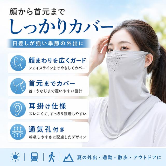 顔・首・うなじまで広くカバーしながら、ムレにくく快適な着け心地で、夏の外出をサポートします。