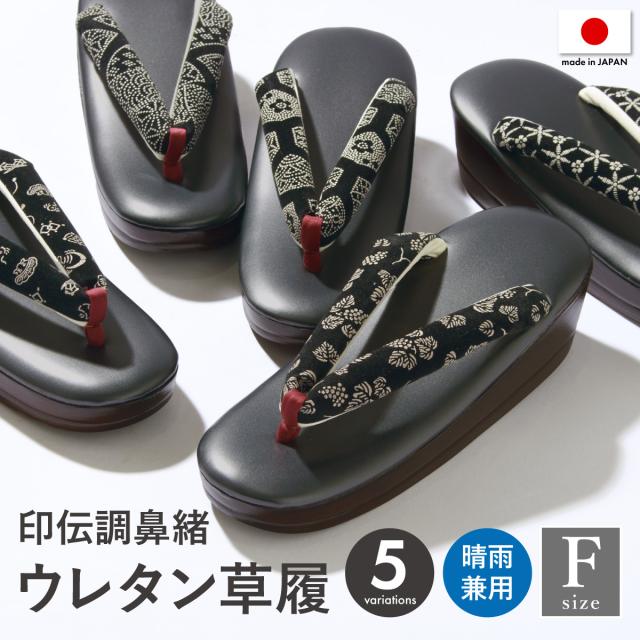 草履 レディース ウレタン 晴雨兼用 Fサイズ 印伝調 カジュアル 通年 艶消し マット ダークグレー 黒 色紙 亀甲 桜麻の葉 葡萄 宝尽くし 小判型 小紋 紬 色無地 ぞうり ゾウリ 女性 和装 日本製 送料無料