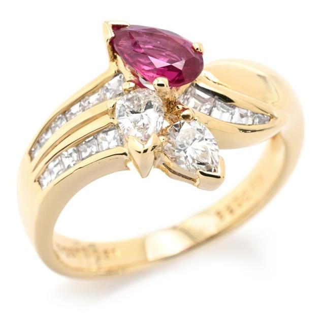 0.57ct天然ルビー リング 13号 K18YG 0.6ct天然ダイヤモンド ペアシェイプカット 植物 一粒 18金 イエローゴールド 地金5.3g 中古 送料無料