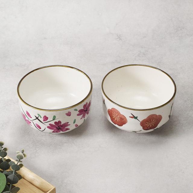 柔らかな白い粉引の風合いに、鮮やかな桜や梅が手書きされた温かみのあるデザインの抹茶椀です。