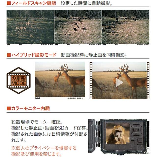 人の目の行き届きにくい場所の監視・防犯、鳥獣被害対策、動物の生態観察、私有地(駐車場・山林)・工場・資材置き場・広大な敷地(ゴルフ場、田園、果樹園)などの監視・管理・牽制効果・証拠写真の取得など