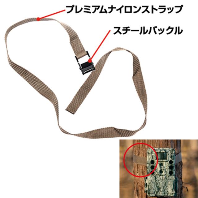 立ち木や支柱にトロフィーカムを括り付ける固定ストラップ(標準付属)