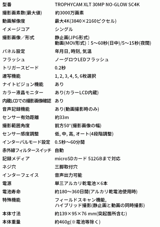 ■ トロフィーカムXLT30MPノーグロウSC4K | 3000万画素屋外型センサーカメラ【防犯カメラ】【監視カメラ】【トレイルカメラ】【屋外対応】