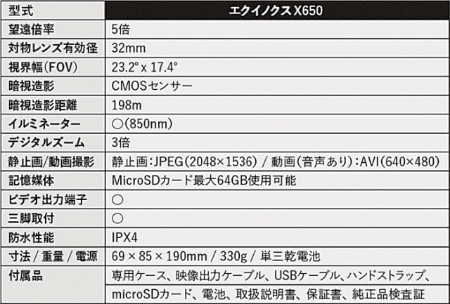 EQUINOX X650(エクイノクスX650)は、最大暗視造影約200mで、イルミネーター内蔵のデジタル暗視スコープデジタルカメラです。