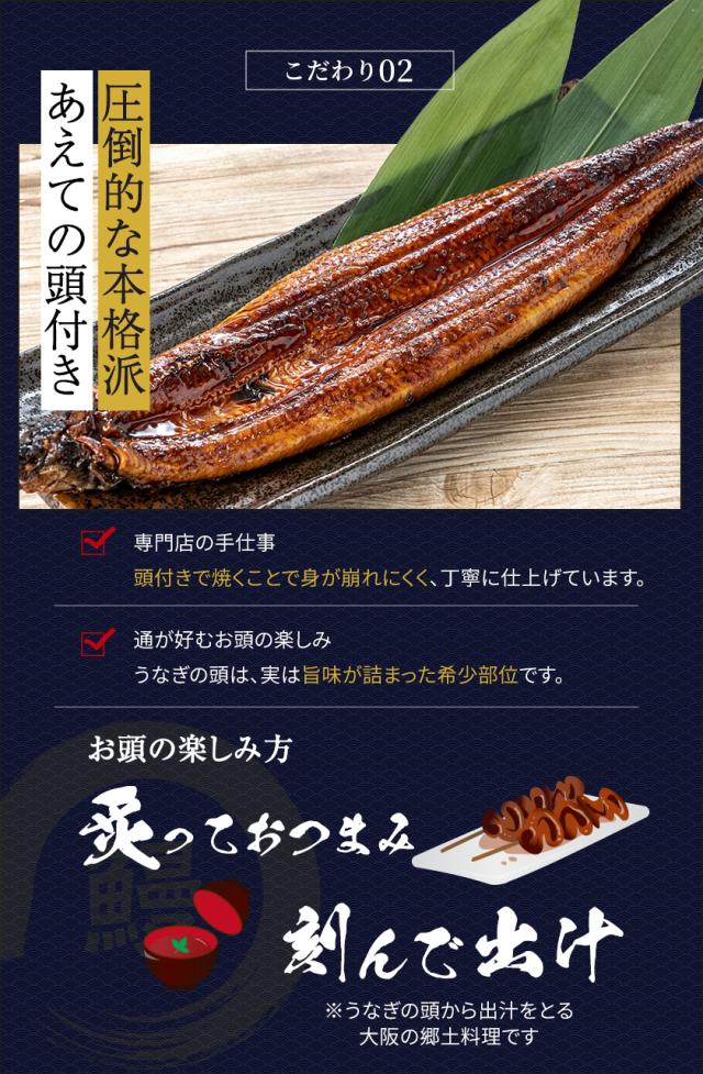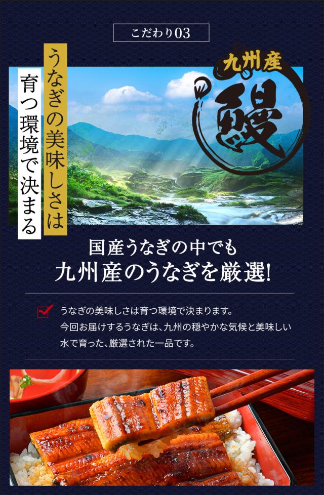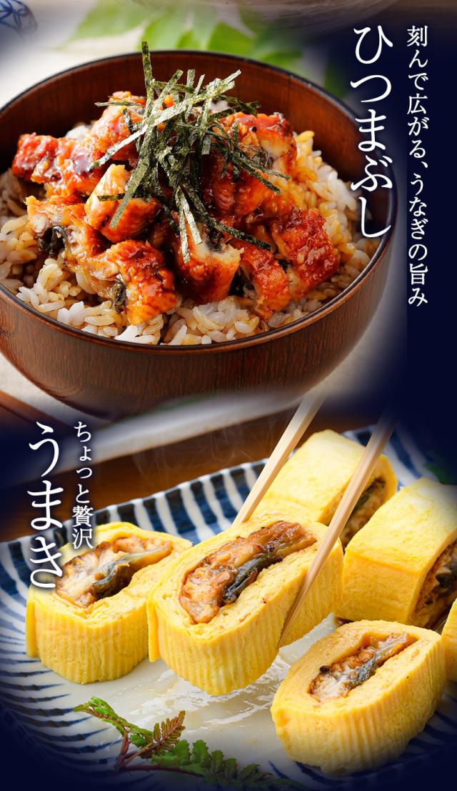 うなぎ(九州産)、しょうゆ、みりん、砂糖、水あめ、酵母エキス、でん粉、果糖ぶどう糖液糖、米こうじ、うなぎエキス、寒天、(原材料の一部に小麦、大豆を含む)