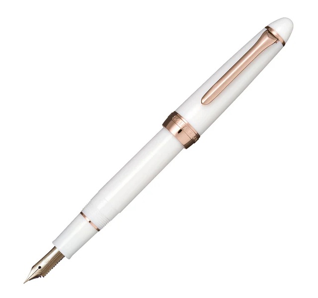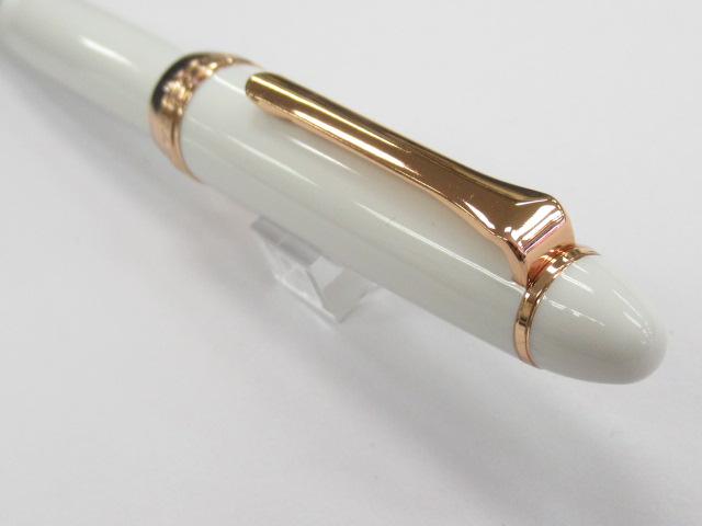 パールホワイトの光沢ある軸に、ピンクゴールドのパーツを組み合わせた万年筆