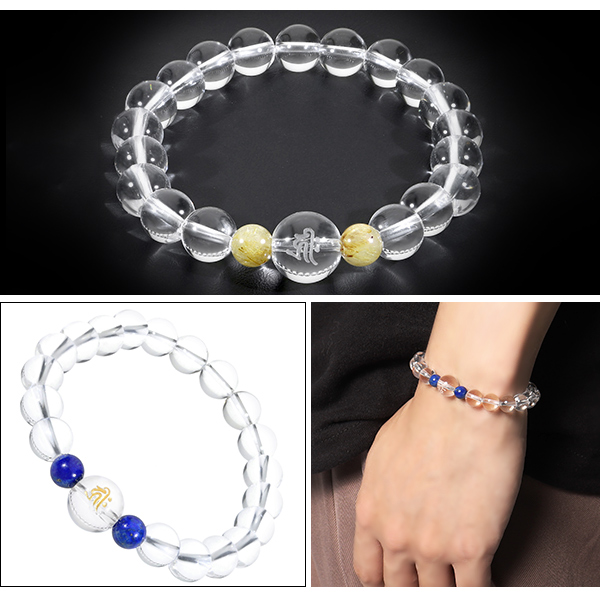 自分の干支をお選びいただける、梵字(ぼんじ)の彫り水晶を用いた天然石ブレスレットです。