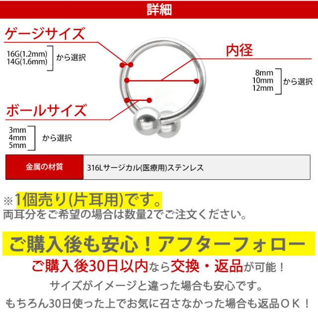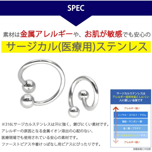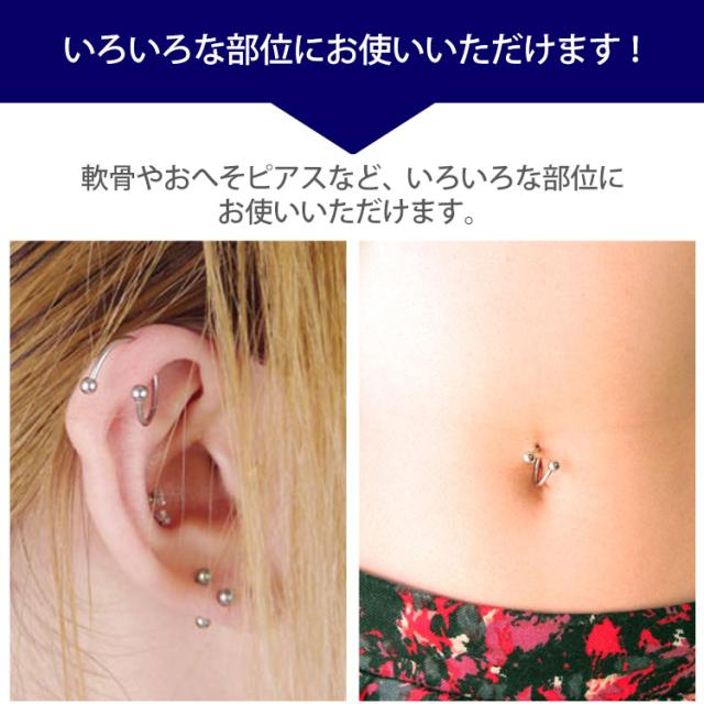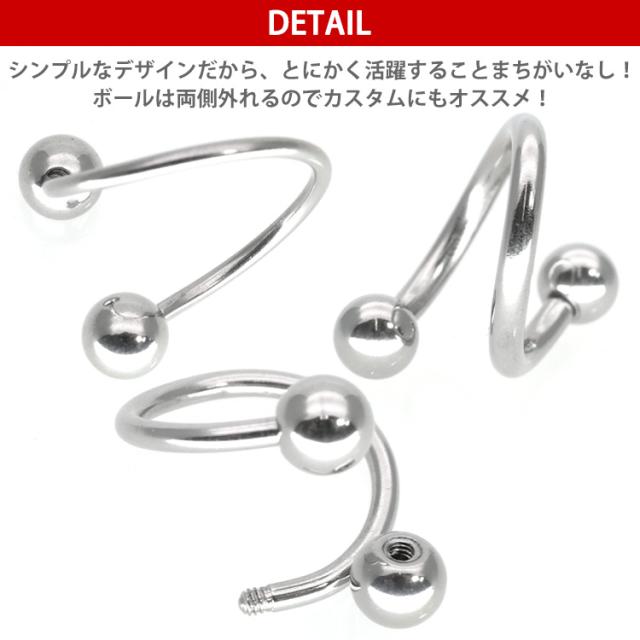 両端にボールがついた基本ジュエリー、ストレートバーベルが進化して出来た「スパイラルバーベル」は、ひねったようなユニークな形状が最大の特徴です。シンプルさを重視したスタンダードなボディピアスの中で、使いやすさと個性を持ち合わせた欲張りアイテムです。くるくると巻きつくようなユニークな形は、他のシンプルなボディピアスと合わせて着けても、もちろん単品でも存在感は抜群です。太さは16G・14Gの2サイズからお選びいただけます。耳たぶやヘリックスなどの軟骨部分はもちろん、おへそにも使える万能アイテムなので、サイズ違いで持っていると部位ごとに使い分けることが出来てとても便利です。材質はアレルギーが起きにくいサージカル(医療用)なので安心してお使いいただけます。