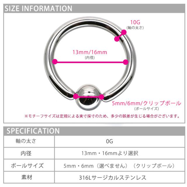 最もシンプルなリングタイプのボディピアスです。キャプティブビーズリング(CBR)やボールクロージャーリング(BCR)と呼ばれ、多くのボディピアスユーザーに愛されているピアスです。12Gサイズは通常の16Gサイズや14Gサイズよりも太くなっており、よりボディピアスをかっこよくみせることができます。内径のサイズも3サイズからご選択いただけます。商品の材質はサージカルステンレスを使用しており、金属アレルギーの方にも安心してご使用いただけます。