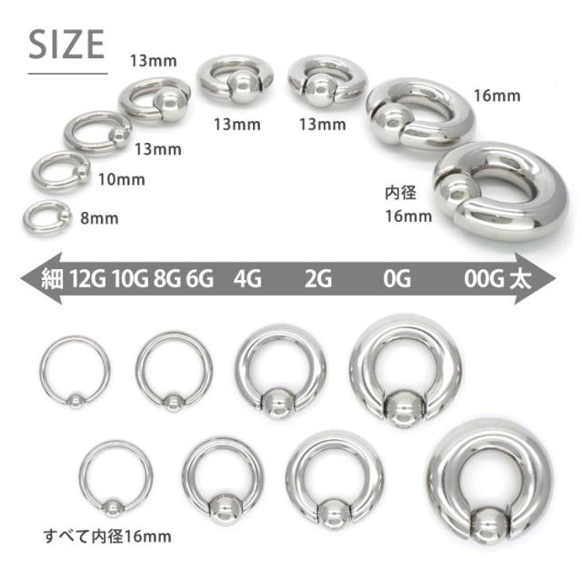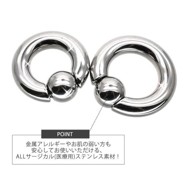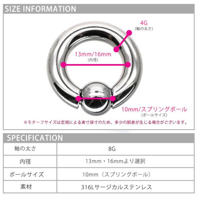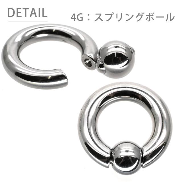 最もシンプルなリングタイプのボディピアスです。キャプティブビーズリング(CBR)やボールクロージャーリング(BCR)と呼ばれ、多くのボディピアスユーザーに愛されているピアスです。4Gサイズはかなり太くなっており、よりボディピアスをかっこよくみせることができます。内径のサイズも2サイズからご選択いただけます。ボール部分は左右にバネ式の突起がついたスプリングタイプなのでプライヤーを使わず簡単に着脱ができます。商品の材質はサージカルステンレスを使用しており、金属アレルギーの方にも安心してご使用いただけます。