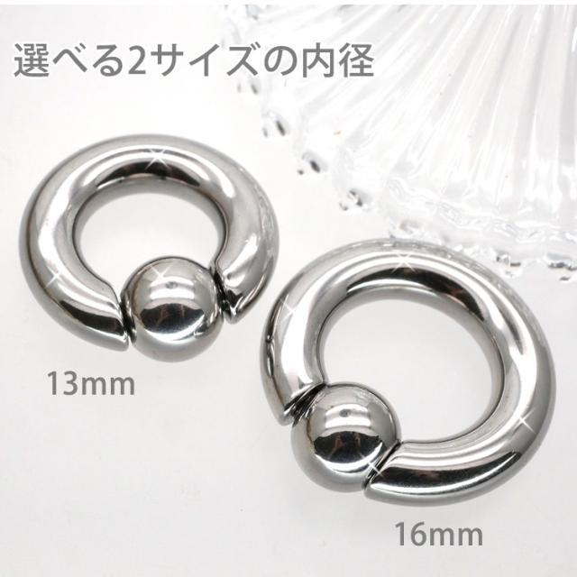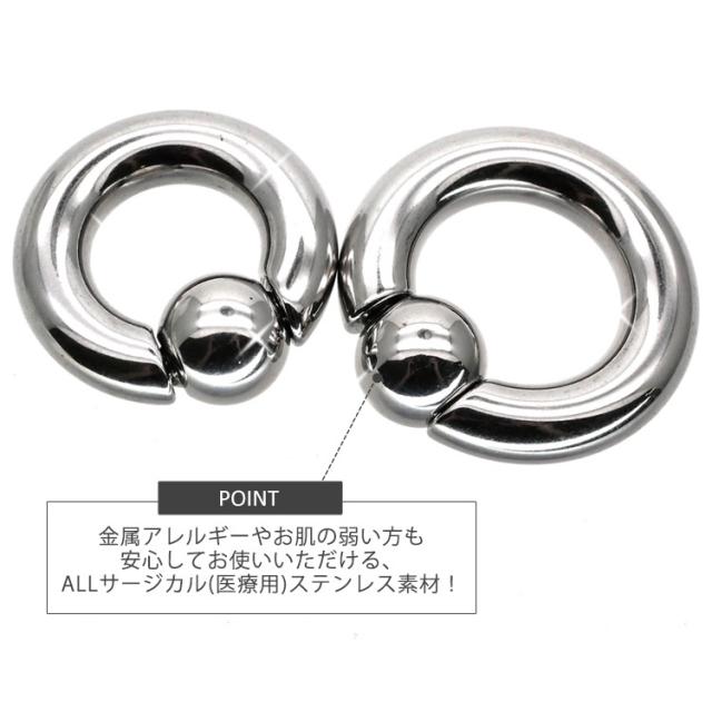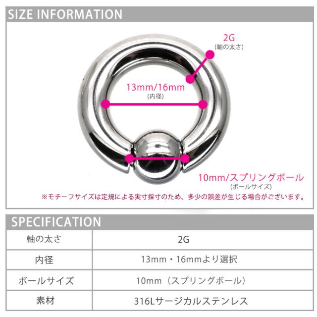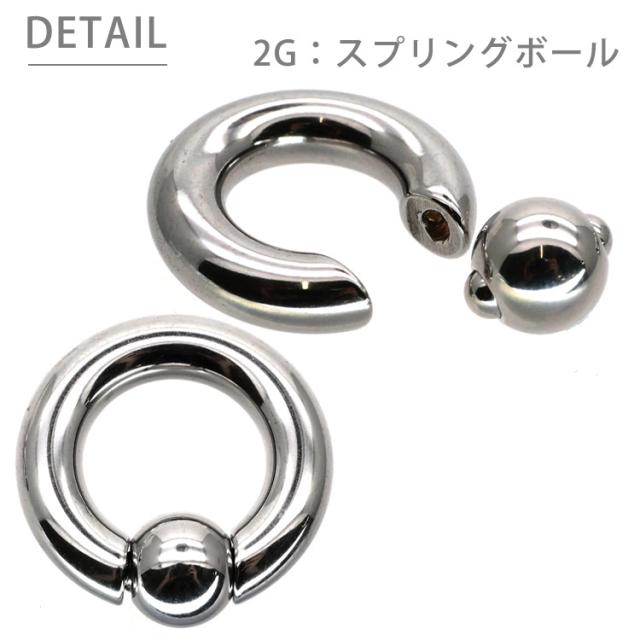 最もシンプルなリングタイプのボディピアスです。キャプティブビーズリング(CBR)やボールクロージャーリング(BCR)と呼ばれ、多くのボディピアスユーザーに愛されているピアスです。2Gサイズはかなり太くなっており、よりボディピアスをかっこよくみせることができます。内径のサイズも2サイズからご選択いただけます。ボール部分は左右にバネ式の突起がついたスプリングタイプなのでプライヤーを使わず簡単に着脱ができます。商品の材質はサージカルステンレスを使用しており、金属アレルギーの方にも安心してご使用いただけます。