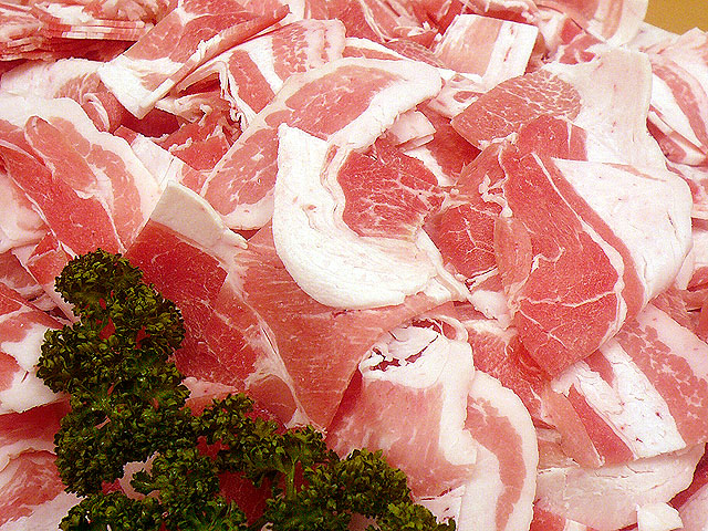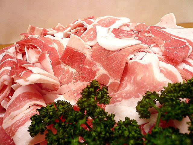 「豚こま切れ(切落し)」は豚肉の全体のあらゆる部位が混じっています。ロース、肩ロース、ばら、もも、肩肉、ほほ肉などなど。大分県産(または九州産)の豚を使用