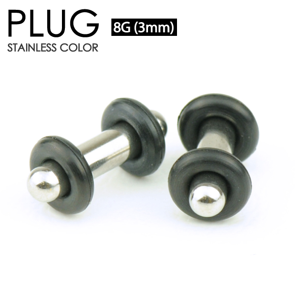 【メール便対応】プラグ 8G(3mm) サージカルステンレス316L(医療用) ボディピアス 両側をゴムで固定 定番ボディーピアス イヤーロブ PLUG 8ゲージ(3ミリ)┃