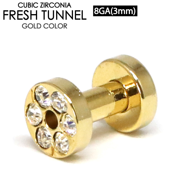 メール便 送料無料 フレッシュトンネル ゴールド ラインストーン仕様 8GA(3mm) サージカルステンレス316L ボディピアス【ジュエル付 ロブ アイレット イヤーレット】8ゲージ ┃