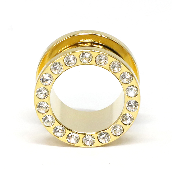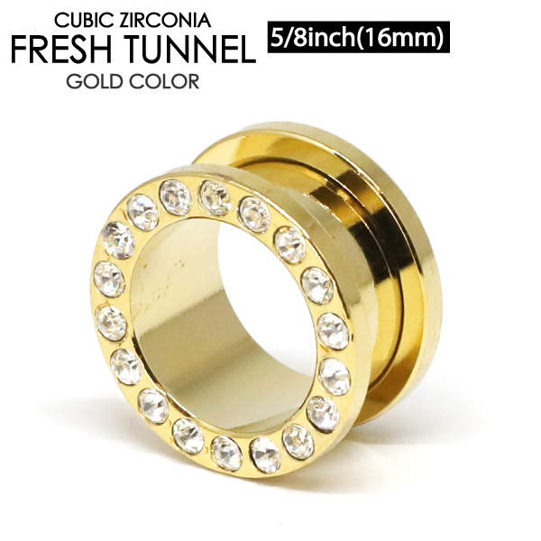 メール便 送料無料 フレッシュトンネル ゴールド ラインストーン仕様 5/8inch(16mm) サージカルステンレス316L ボディピアス【ジュエル付 ロブ アイレット イヤーレット】 16ミリ┃