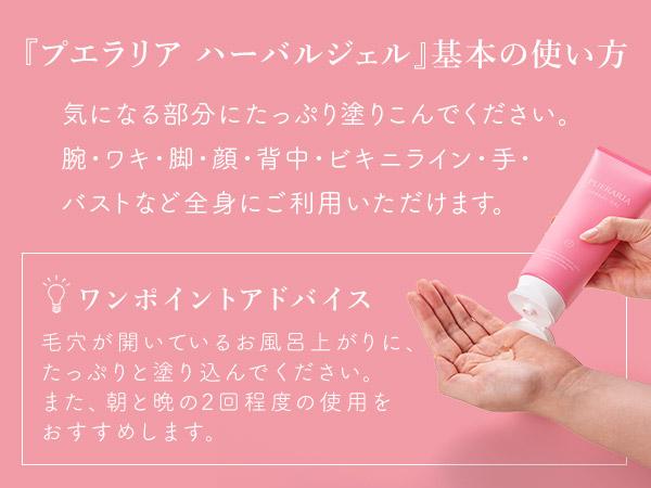 また、このプエラリアジェルは、バストアップのためのケアにも嬉しいクリーム(ジェル)です。 バストマッサージをする時に手の平になじませて使えば、ギュッとした実感を感じていただけやすくなります…!