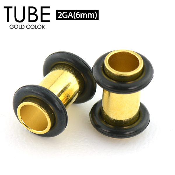 【メール便対応】チューブ ゴールド 2G(6mm) GOLD カラー 両側をゴムで固定 定番ボディーピアス アイレット スタイリッシュ イヤーロブ ホールトゥピアス 2ゲージ(6ミリ)┃