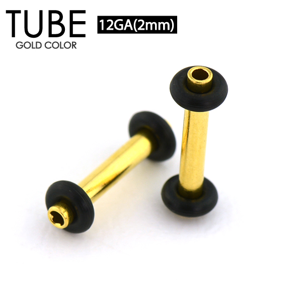 【メール便対応】チューブ ゴールド 12G(2mm) GOLD カラー 両側をゴムで固定 定番ボディーピアス アイレット スタイリッシュ イヤーロブ ホールトゥピアス 12ゲージ(2ミリ)┃