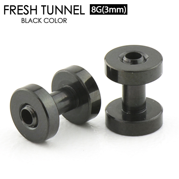 【メール便対応】フレッシュトンネル ブラック 8G(3mm) BLACK アイレット ボディーピアス サージカルステンレス カラーコーティング加工 イヤーロブ ホールトゥに最適 8ゲージ┃