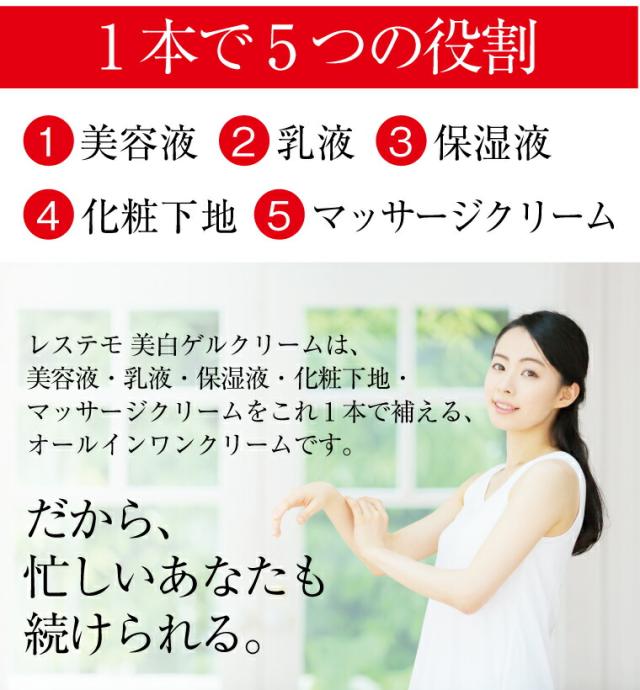 ●美白美容液、乳液、保湿液、化粧下地、マッサージクリームがオールインワン