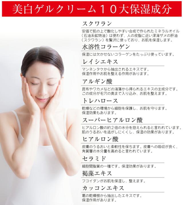 洗顔後、1回1プッシュ(3g)を目安にゲルクリームをマッサージするようにつけます。 ゲルクリームの前に、美白美容液をご使用頂くとより効果的です。 |