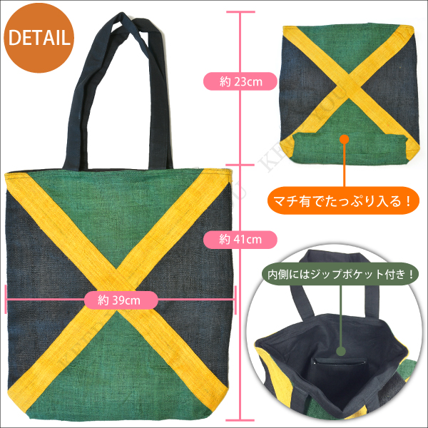 【メール便対応】レゲエ ジャマイカ柄 麻素材 トートバッグ [約41cm×39cm] 天然の植物素材 鞄 ヘンプ ジャマイカカラー 国旗 エスニック ショッピングバッグ サブバッグ┃