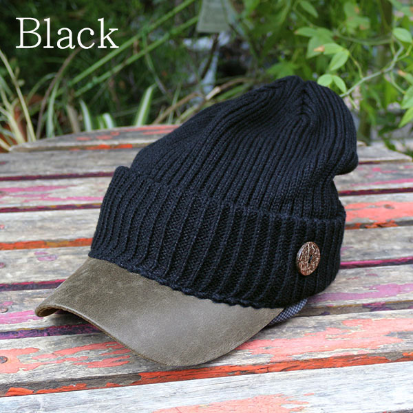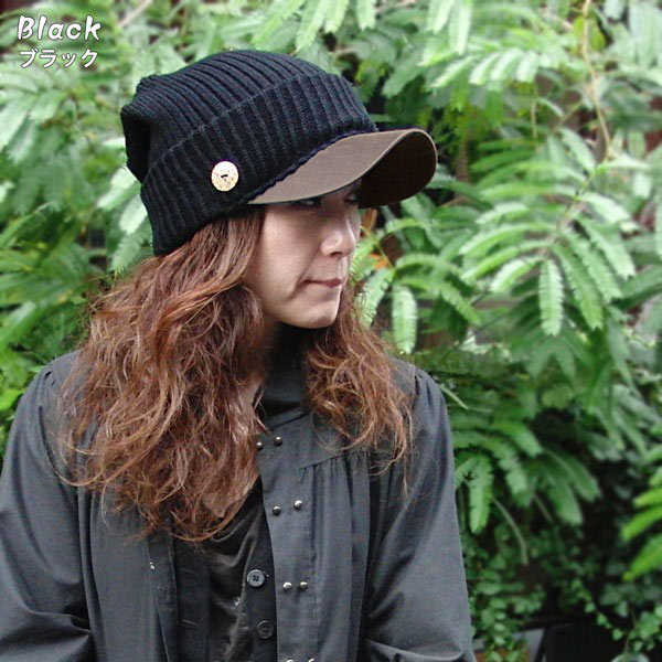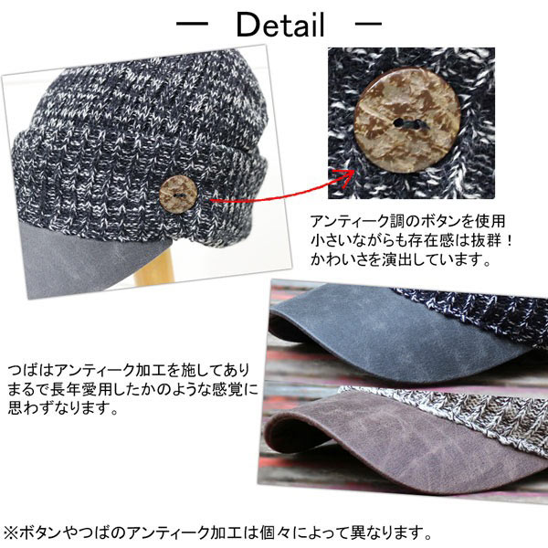 帽子 このニットキャスケットは、ニットとアンティーク合皮の組み合わせが、カッコかわいく仕上がったキャスケットです。