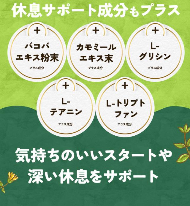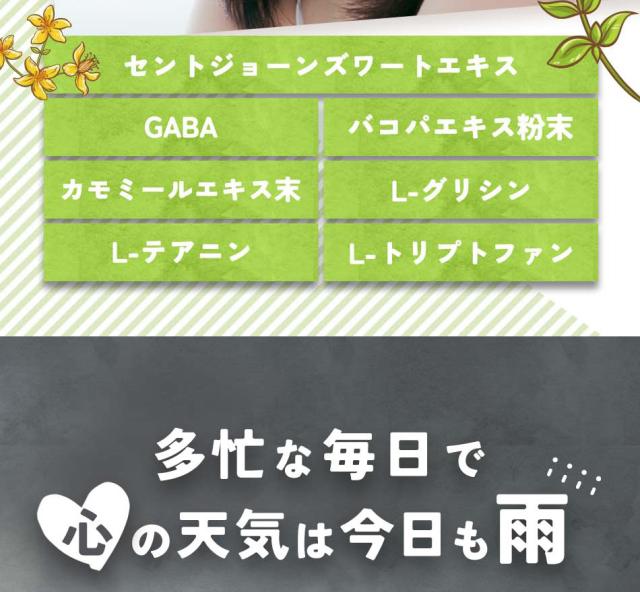 セントジョーンズワートエキス末(スペイン製造)、デキストリン、澱粉、γ‐アミノ酪酸(GABA)、バコパエキス粉末、カモミールエキス末/ゼラチン、ステアリン酸Ca、L-グリシン、微粒酸化ケイ素、L-テアニン、L-トリプトファン、カラメル色素